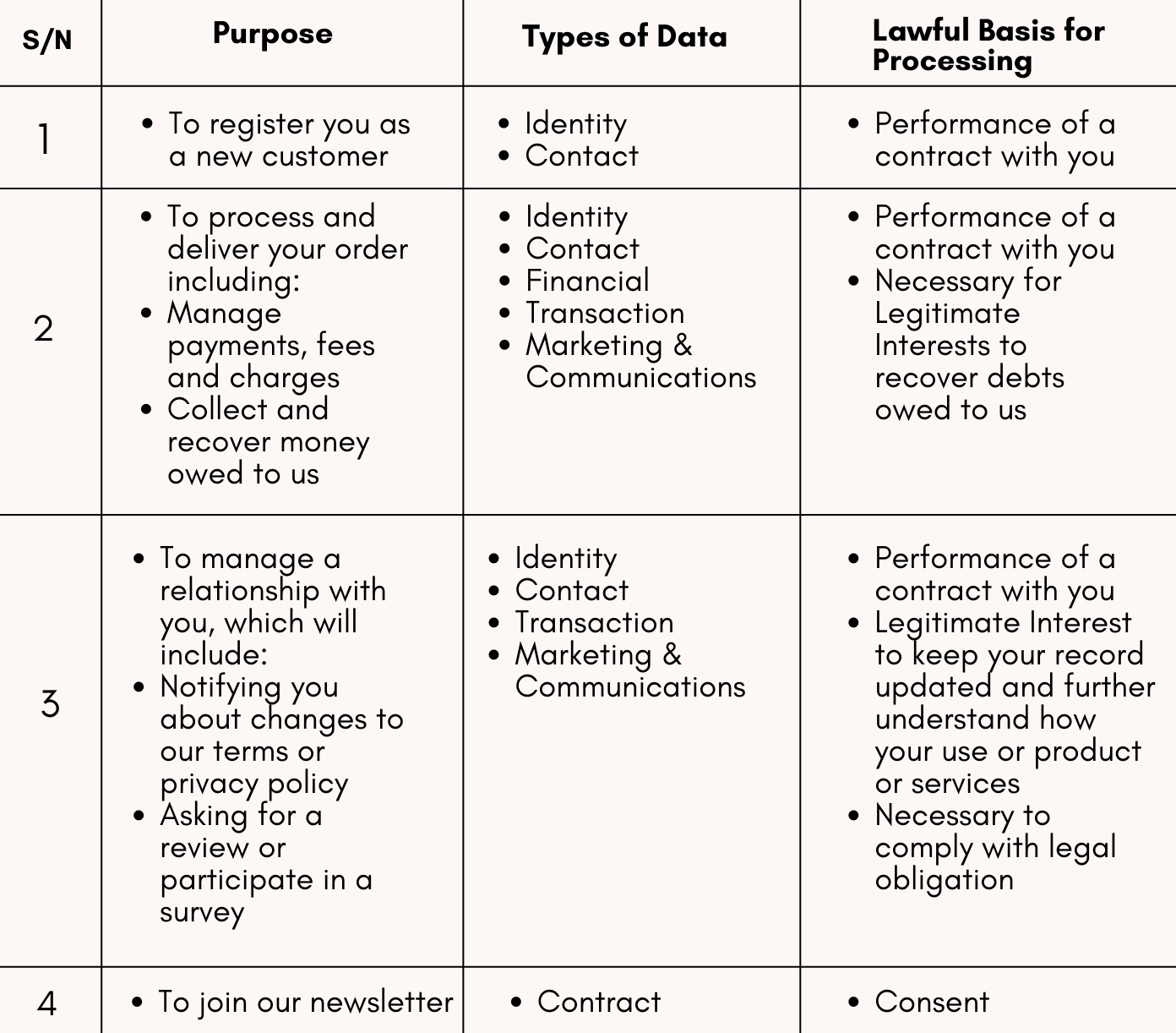 The table below shows a detailed information about why we collect your data, the type of data we collect and the lawful basis for processing that data.
